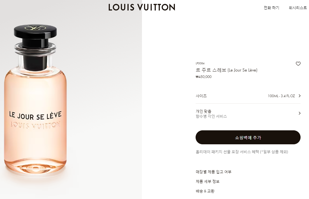 | 선별된 루이 비통 매장과 kr.louisvuitton.com에서만 구매 가능. 루이 비통 향수 주문 시 직접 사용하거나 선물하기 전에 향을 확인할 수 있는 무료 샘플 증정. 시향 후, 원하는 경우 미개봉 향수를 반품하여 환불 가능 |